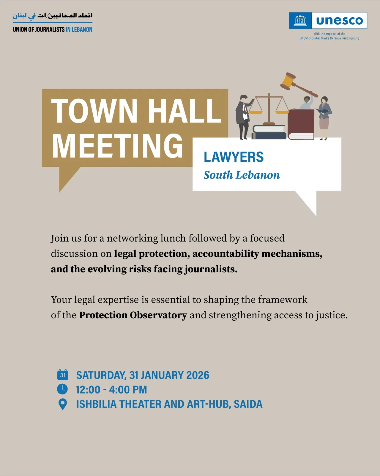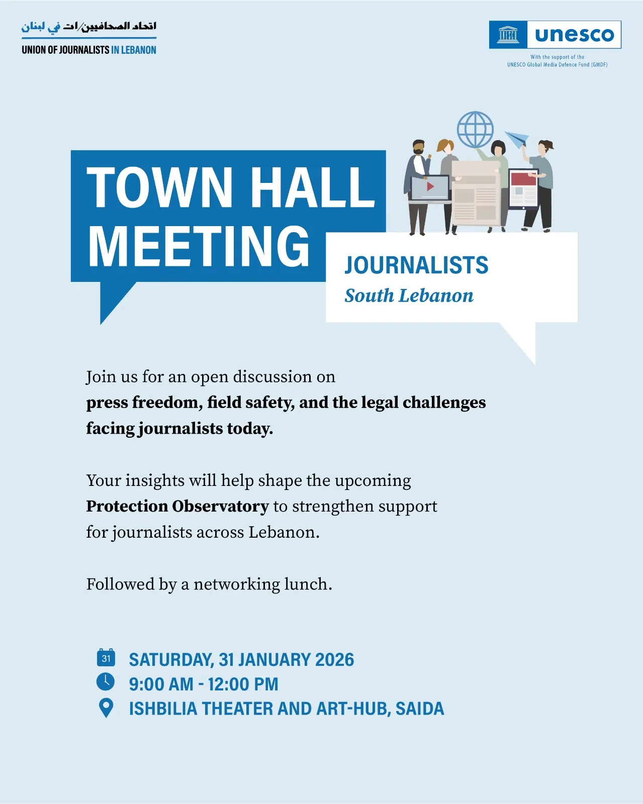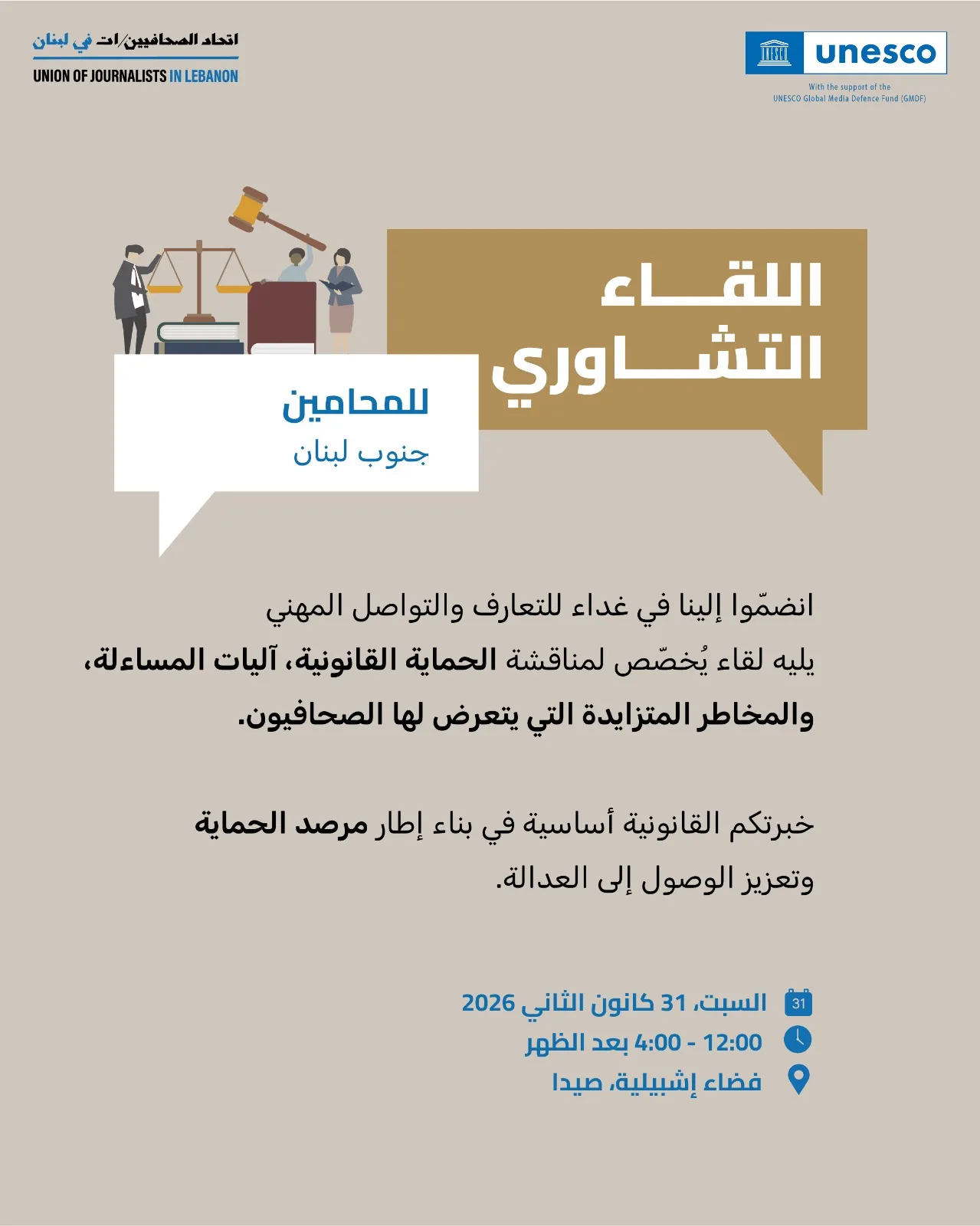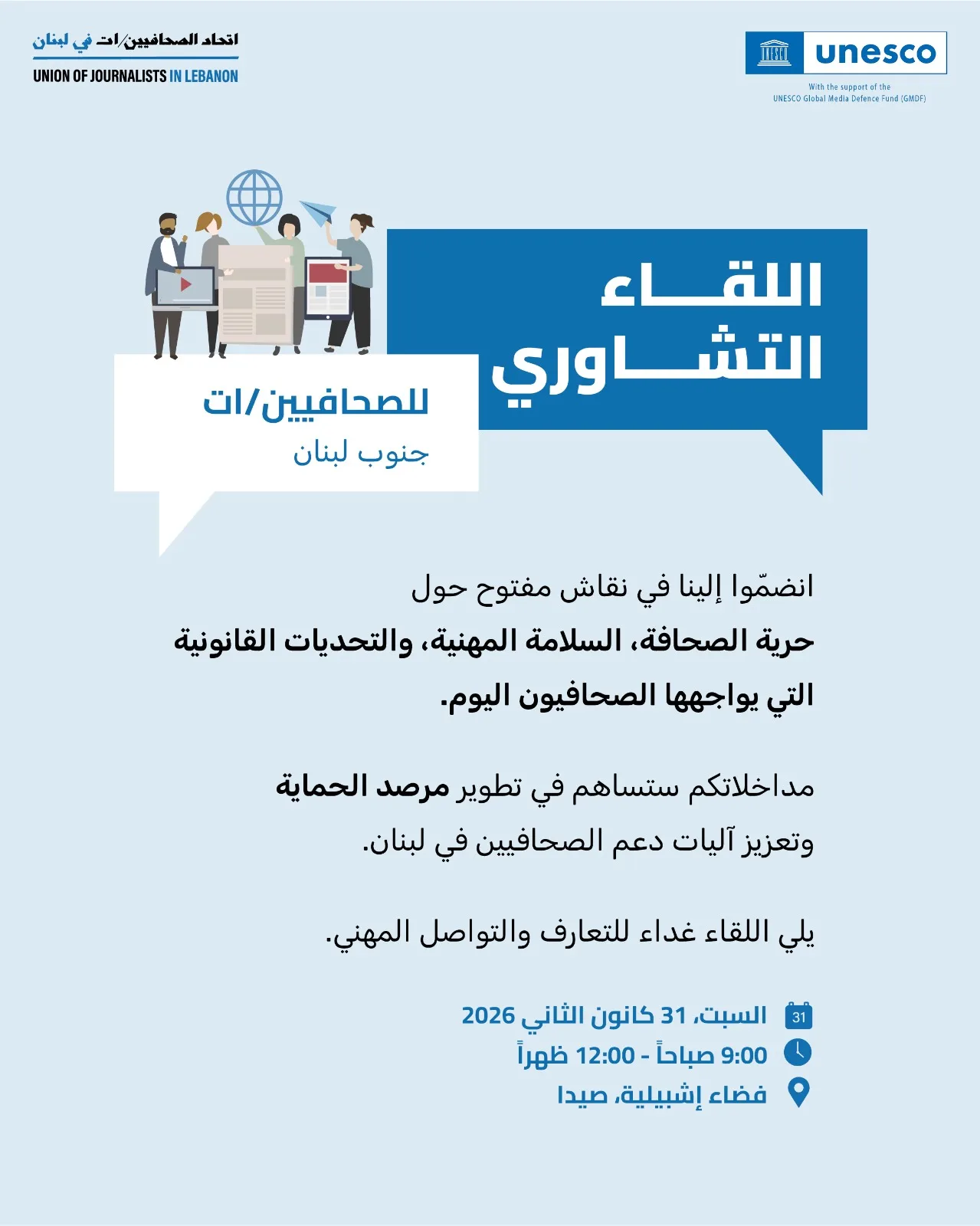 يدعو الاتحاد جميع الصحافيين والصحافيات والمحامين والمحاميات في محافظة الجنوب للمشاركة في لقاء تشاوري بدعم من اليونسكو، مخصّص لنقاش مفتوح ومباشر حول حرية الصحافة، حقوق العمل والسلامة المهنية، والاستدعاءات والتحديات القانونية التي يواجهها الصحافيون في المناطق.